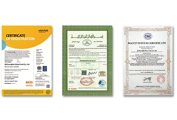 美燁所用設備設施均按出口食品生產企業注冊衛生規范要求設計安裝,本公司已經通過美國HACCP、英國BRC、清真HALAL認證,并在美國FDA、歐盟、俄羅斯等注冊備案,現...
